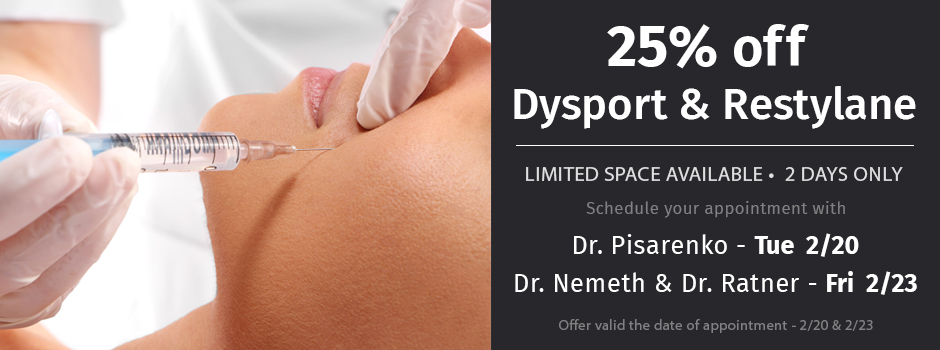 Repetitive motion of muscles of facial expression cause wrinkles to form with time. These wrinkles can be corrected by weakening the muscles. Prescription injectables that our surgeons may use to weaken specific muscles of the forehead, between the eyebrows, or around the eyes to temporarily weaken them. These products may also be used to treat excessive sweating, a condition known as “hyperhidrosis”.